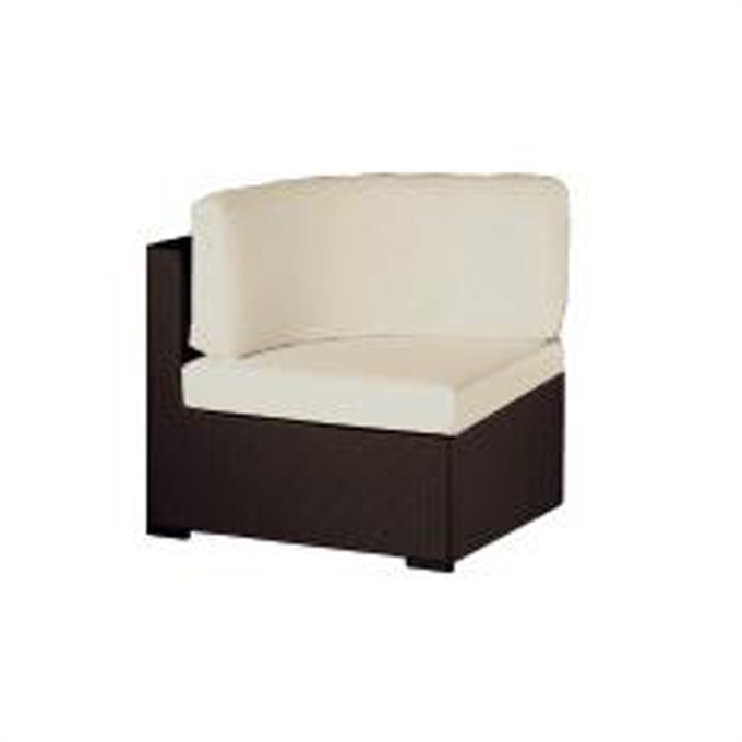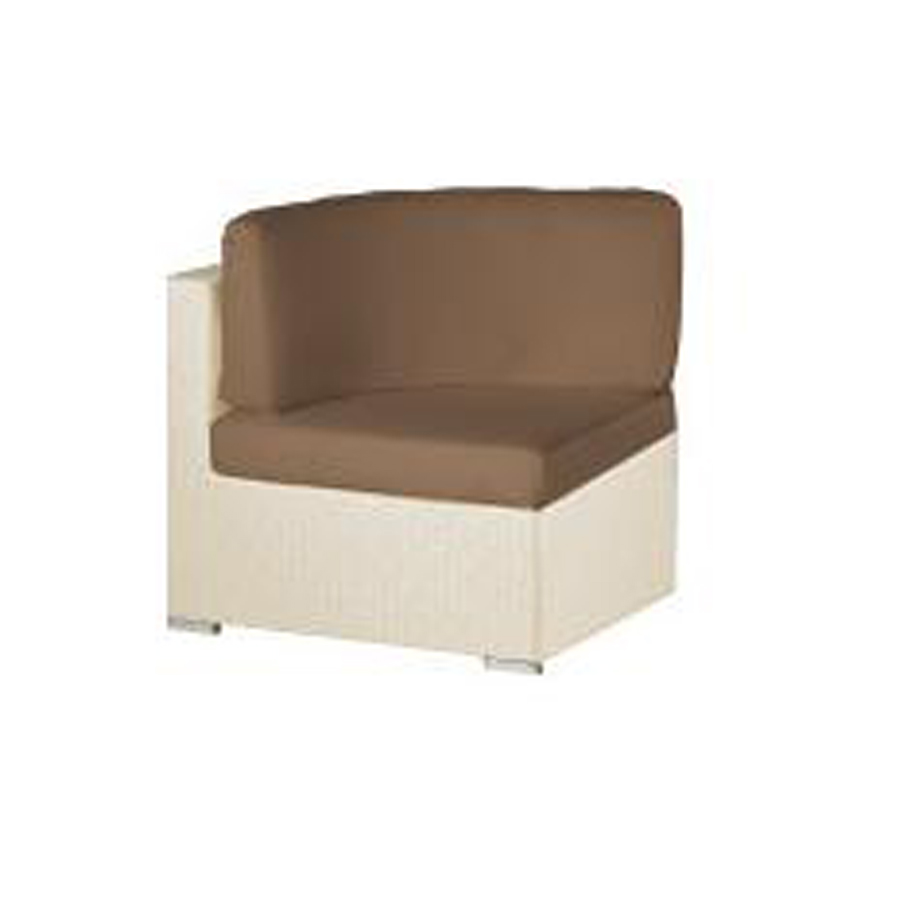 Elemento angolare arrotondato con struttura in alluminio e rivestimento in filo plastificato colore wengé (con cuscini beige) o crema (con cuscini marrone chiaro). Può essere montato in composizione con l'ART.13076 e/o con l'ART.13077 per realizzare molteplici combinazioni. I cusnini sono sfoderabili