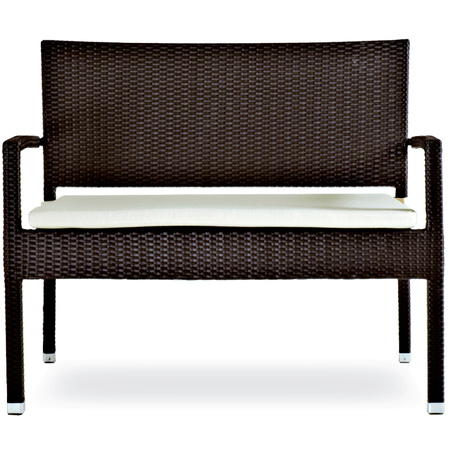 Divanetto con struttura in alluminio e rivestimento in materiale plastico colore wengé. Su richiesta è disponibile il cuscino in colore chiaro ecrù, è sfoderabile e lavabile