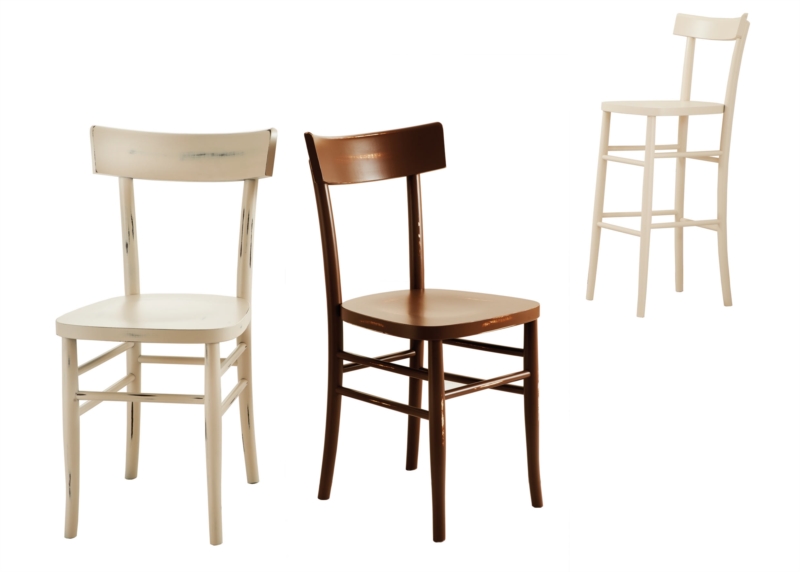Sedia da trattoria con sedile in legno, finitura "Shabby Chic" o in altre varianti