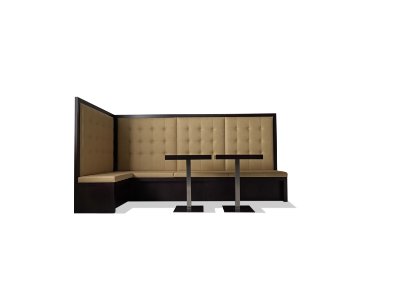 Sistema di sedute modulari con sedile e schienale imbottito. La struttura è in legno e può essere tinta a richiesta, il sedile e lo schienale sono imbottiti e rivestiti in ecopelle o tessuto a scelta