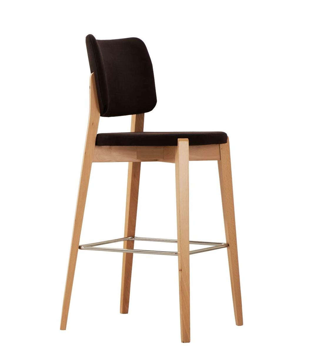 Sgabello da bar in faggio con poggiapiedi in metallo, sedile e schienale rivestiti in ecopelle o tessuto a scelta